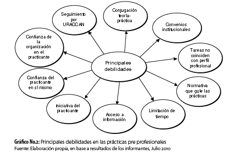 Entre los hallazgos se destacaron aspectos favorables y desfavorables de las prácticas pre profesionales, tales como: el afianzamiento de conocimientos, oportunidad laboral y visión de la realidad laboral, establecimiento de relaciones interpersonales, falta de confianza en sí mismos e iniciativa propia, visualización de éstas como un requisito a cumplir, poca apertura y confianza de las instituciones que inciden de forma negativa en el desarrollo y alcance pleno de los objetivos en este proceso.