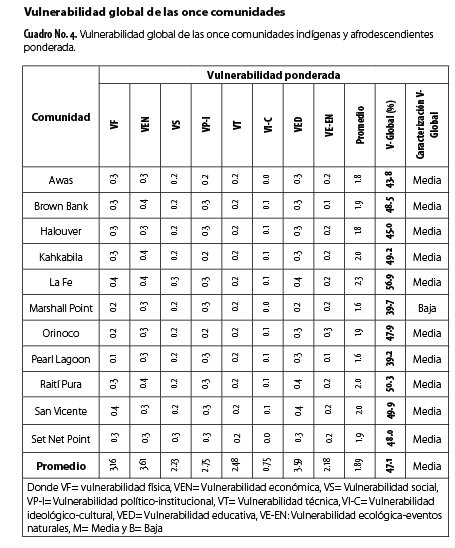 Cuadro No. 4. Vulnerabilidad global de las once comunidades indígenas y afrodescendientes ponderada.