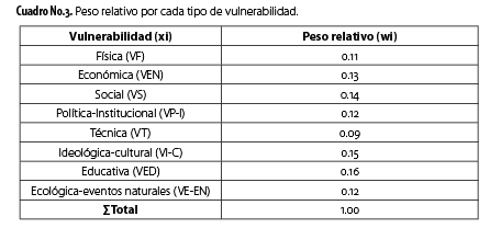 CAdemás, se definió durante la validación de indicadores el peso relativo para cada tipo de vulnerabilidad. El cuadro No. 3 muestra los pesos relativos de cada tipo de vulnerabilidad.