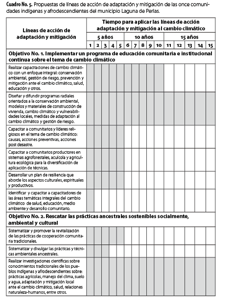 Las líneas definidas en el Cuadro No. 4, corresponden a períodos de corto (5 años), mediano (10 años) y largo plazo (15 años); las cuales se plantean tomando en cuenta la flexibilidad y capacidad de adecuarse a la dinámica y realidad de las once comunidades indígenas y afrodescendientes del municipio. Líneas de intervenciones que deben ejecutarse de forma paulatina y que deben ir acompañadas de procesos de sistematización y evaluaciones continúas, con el propósito de mantener una permanente reflexión y ajuste de actividades en caso de que requiera una redefinición de la planificación, según resultados obtenidos.
