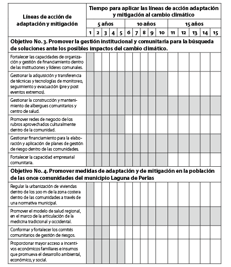 Las propuestas de líneas de acción de adaptación y mitigación se elaboraron a partir de los resultados del análisis de la vulnerabilidad global de las once comunidades indígenas y afrodescendientes del municipio Laguna de Perlas, de la estrategia nacional ambiental del cambio climático realizado por el Gobierno de Nicaragua (2010) y las líneas propuestas por Cunningham et al (2010). Partiendo de esto, las líneas establecidas parten de los siguientes objetivos: