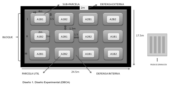 El ensayo fue un diseño bifactorial en bloques completos al azar (DBCA), con 4 tratamientos y 3 repeticiones. Se estudiaron 2 factores; el factor A y el factor B, y fue analizado bajo un modelo lineal de DBCA[8], en inicio porque, el diseño no presentó las unidades experimentales adecuadas y en segundo, porque se pretendió analizar un factor por separado y, no el cambio de un factor según los niveles de los otros factores o su interacción. A continuación se sintetiza.