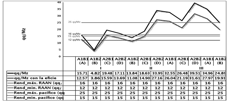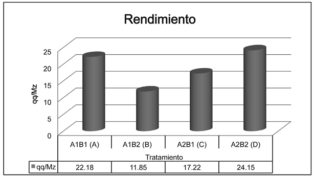 De acuerdo a la gráfica No. 14, los rendimientos obtenidos prevalecen en los tratamientos A (A1B1) y D (A2B2), con los mayores rendimientos con 22.18 y 24.15 qq/Mz que están estimadas por los rendimientos máximos del Pacífico y mayores de la RAAN.