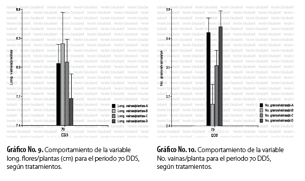 La prueba muestra diferencias estadísticas en ambas variables entre el tratamiento, prevaleciendo los dos últimos tratamientos (C y D), en el caso de la variable No. Vaina por planta (gráfica No. 11)