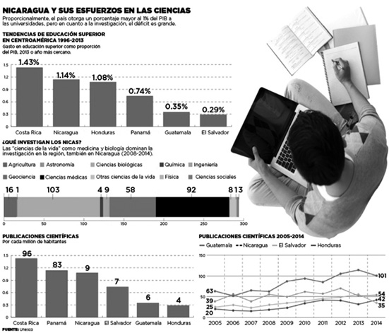 El Estado de Nicaragua es el sexto país de América Latina y el Caribe en dedicar porcentualmente más del Producto Interno Bruto (PIB) a la Educación Superior (1.14%.) Sin embargo, esta inversión sigue sin permitir que exista un salto en la producción científica. Aunque Cuba es el país de América Latina y el Caribe con mayor índice en el desarrollo de la educación con un 13% del Producto Interno Bruto (UNESCO, 2013). El informe de Ciencia emitido por la Unesco (2016) señala que Nicaragua incrementó el número de publicaciones científicas de 39 a 54 marcando una tendencia latinoamericana que pasó del 4% a publicar a el 5.2% del material científico global, en el período 2005-2014, aunque sólo hay 9 de estos estudios por cada millón de habitantes. En cambio, Chile despunta esta estadística en América del Sur con 350 por millón. No obstante, Nicaragua, está por encima de sus vecinos: El Salvador (7); Guatemala (6); y Honduras (4), pero muy por debajo de Costa Rica (96) en materia de producción científica.