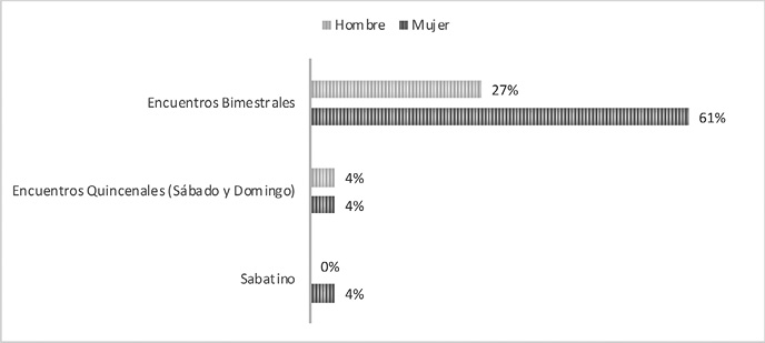 En la figura 5, podemos observar que el 88% de los participantes desean estudiar sus estudios doctorales por encuentros bimestrales, un 8% de los entrevistados desea estudiar por encuentros quincenales (sábado y domingo), y finalmente un 4% desea estudiar en la modalidad sabatina. Por lo que se infiere que los entrevistados consideran idóneo estudiar el programa de Doctorado en Estudios Interculturales en la modalidad de encuentros bimestrales, porque permitiría cumplir con las jornadas laborales y las responsabilidades de estudios.