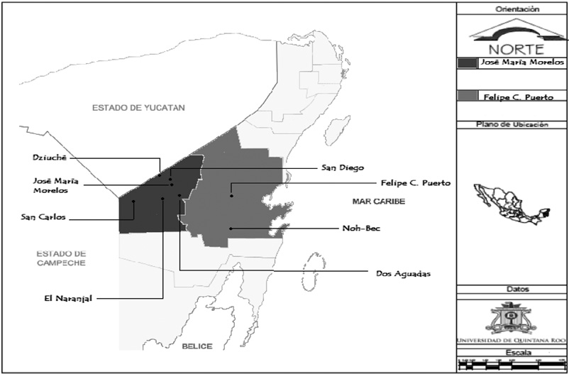 La Zona Maya de Quintana Roo, México. Esta región está formada por los dos municipios con mayor número de población indígena de la etnia maya y de monolingües mayas (yucateco) del estado de Quintana Roo. Las localidades de estudio son José María Morelos, Dos Aguadas, El Naranjal, San Carlos, San Diego, Dziuché, en el municipio de José María Morelos; y, Felipe Carrillo Puerto y Noh-Bec, en el municipio de Felipe Carrillo Puerto.