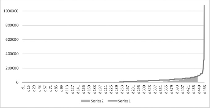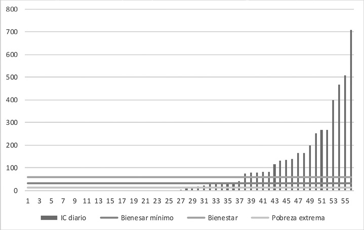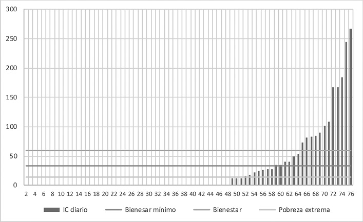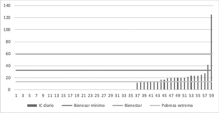 La figura 8, perteneciente a Dos Aguadas, muestra que el 55.76% de las mujeres de la muestra tienen un IC igual a cero lo que automáticamente las coloca por debajo de la línea de pobreza extrema. El 15.38% reporta ingresos por debajo de la línea de pobreza extrema, lo que deriva en que sean en total 70% del total de mujeres las que viven con menos de $1.25 dólares americanos al día. Ahora bien, el resto de las mujeres tiene un ingreso que no rebasa la línea de bienestar mínimo que CONEVAL (año) establece, es decir, para el gobierno mexicano, el 100% de las mujeres de la muestra en Dos Aguadas viven en condiciones de pobreza extrema.