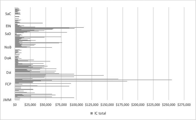 En la figura 2 se observa el ingreso de toda la muestra, resalta en ella tanto el outlayer máximo, cuyo IC es superior al millón de pesos anuales, como los outlayer mínimos que están con IC igual a cero. La figura 3 establece una comparación entre los ingresos de hombres y mujeres, y es claro en el gráfico la desigualdad y vulnerabilidad que parecen las mujeres, pues son ellas las que mayor incidencia tienen de IC igual a cero y la mujer que mayor ingreso registra no es ni cercana al hombre con mayor ingreso. De ahí el énfasis de este trabajo en esbozar el fenómeno de la pobreza extrema en mujeres indígenas de Quintana Roo, México.