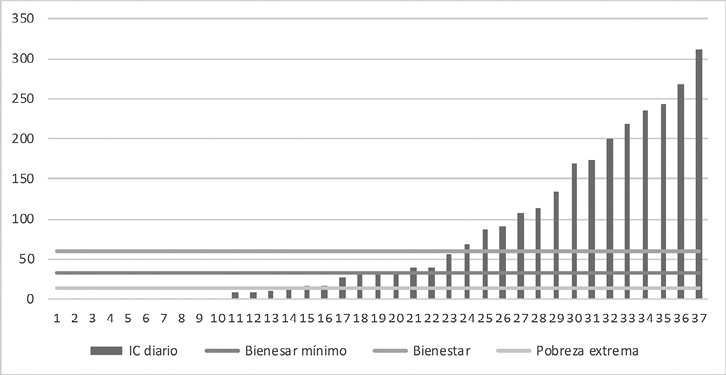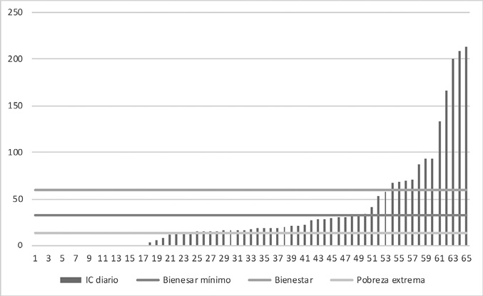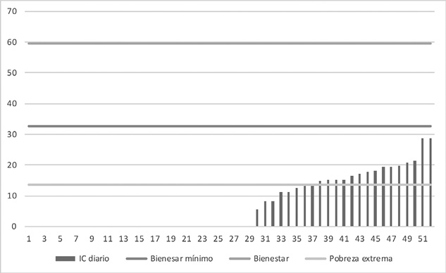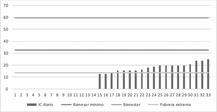 La figura 7, de la alcaldía Dziuché, muestra que el 18.57% de las mujeres no tienen ingreso alguno (y dos casos tienen ingres diario de menos de un peso), 24.28% de las mujeres que tienen algún ingreso están por debajo de la línea de pobreza extrema de Banco Mundial, es decir, 42.85% pertenece a esta categoría. Ahora bien, 21.42% superan la línea de pobreza extrema, pero no la de bienestar mínimo que establece el CONEVAL (S/F), o sea, 64.28% de las mujeres de esta localidad viven con ingresos por debajo del bienestar mínimo. Sólo se registran cuatro casos que superan la línea de bienestar mínimo, pero no la de bienestar, lo que arroja un total de 70% en situación de algún tipo de pobreza.