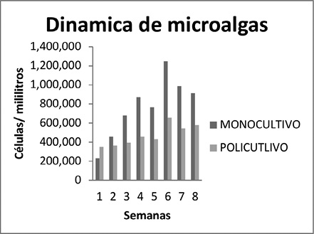 Los conteos de micro algas realizados en ambos sistemas de cultivo (monocultivo y policultivo) presentan diferencias significativas entre ambos, siendo el sistema de monocultivo el que presenta los mayores datos de micro algas encontradas en el dispositivo, siendo en la semana 6 donde se observan los mayores datos de conteo para ambos sistemas de cultivo.