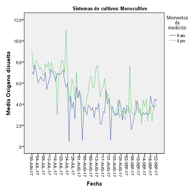 En base a la figura 2: el comportamiento del oxígeno disuelto en el sistema de monocultivo monitoreado en dos momentos del día, presentó un máximo 11.5 mg/lt y un mínimo de 0.6 mg/lt con un valor promedio de 3mg/lt por la mañana y cercano a 6 mg/lt por la tarde.