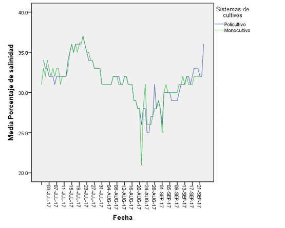 Los datos de salinidad tuvieron comportamientos similares en ambos sistemas de cultivo (policultivo y monocultivo), con una dispersión entre 22 y 36 ppm, con valores por encima de los 30 ppm dentro de las primeras semanas de cultivo, mientras que para las siguientes semanas predominaron valores por debajo de los 30 ppm hasta los 33 ppm. Prevaleciendo así dentro de los rangos óptimos señalados por FONDEPES (Coat., 2004), para la tilapia gris (Oreochromis sp) y (Peralta, 2010), para el pepino de mar (Isostichopus fuscus)
