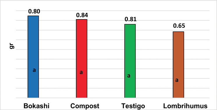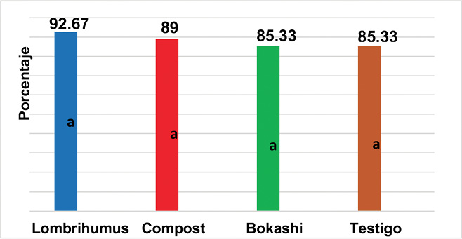 En el análisis de varianza (ANDEVA), refleja que no hubo efectos significativos de los abonos orgánicos sobre la sobrevivencia de botón de oro (Pr>0.05). En términos numéricos figura 1 indica que los mayores índices de sobrevivencia se registran cuando se aplica Lombrihumus y Compost. Como se puede observar, el testigo y el Bokashi, mostraron los valores más bajos en esta variable.
