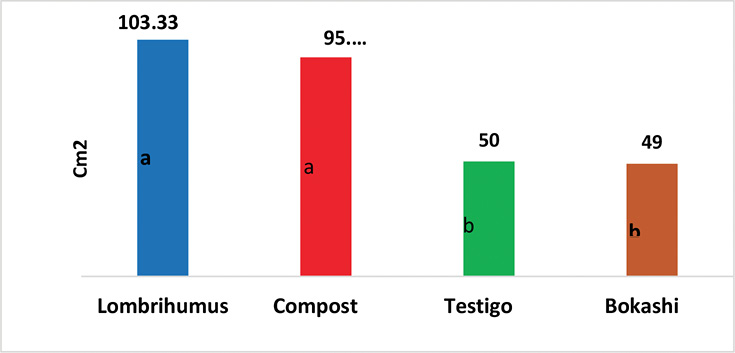 El área foliar es una variable de gran importancia al momento de evaluar pasturas y forrajeras, esta se involucra en el efecto que tendrán los abonos orgánicos sobre ella, en la figura 2 se observa que hay diferencia significativa entre los tratamientos, siendo el Lombrihumus y el compost los que mayores efectos presentaron y difieren del resto de los tratamientos.