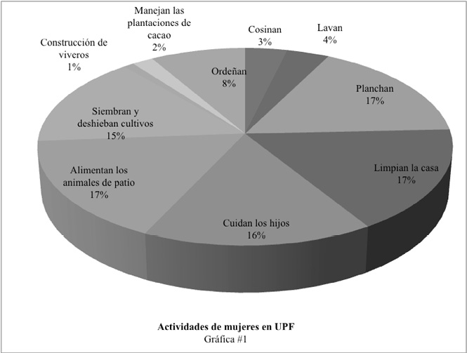 En la gráfica Nº 1. se reflejan las actividades principales que realizan las mujeres en las Unidades Productivas Familiares (UPF) de la comunidad el "Zopilote". El 17 % limpia la casa, plancha y alimenta a los animales de patio, un 16 % cuida a sus hijos, el 15% trabaja en el campo en siembra y deshierbas de los cultivos en las UPF, el 8% labora en ordeño, el 4 % lava ropa de toda la familia, el 3% preparan la alimentación, 2% se encarga de manejar las plantaciones de cacao en sus UPF, y 1% trabaja en construcción de viveros.