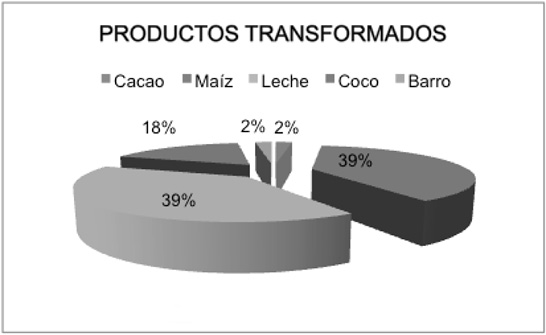 Una vez transformado el maíz, obtienen productos como: horneados de maíz, pinolillo, pozol, atol, tamales, tortillas; de la leche sacan cuajadas, crema, queso, cajetas de leche, del coco producen las cajetas de coco y del barro hacen loceras. De todos estos productos que transforman, solamente a uno de ellos se le da valor agregado como es el cacao, convertido en chocolate, el cual es ofrecido al consumidor con un empaque, generando un ingreso mayor para la economía familiar.