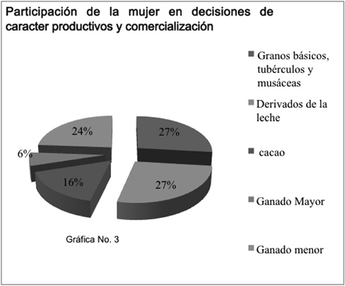 En la gráfica No.3. se observa que el nivel de participación es alto en todo el ciclo productivo, evidenciándose de esta manera, la participación que tiene la mujer en decisiones a la hora de comercializar productos de las UPF. El 27 % de las mujeres participan en la toma de decisión a la hora de la comercialización de la leche y sus derivados; granos básicos, tubérculos y musáceas, el 24 % en ganado menor, el 16 % cacao, el 6 % ganado mayor.