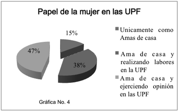 En la gráfica No. 4. se refleja el papel de la mujer en las UPF. El 47 % trabaja como amas de casa y ejercen opinión en las UPF, el 38 % como amas de casa y realiza labores en las UPF, y el 15% únicamente como amas de casa.