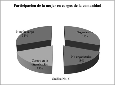 En la gráfica No. 5 se ve reflejada la participación que tienen las mujeres en diferentes cargos en la comunidad. Un 31 % están organizadas dentro de la comunidad y con las diferentes ONG que les apoyan, un 19 % no están organizadas con nadie, el 31 % no tiene ningún cargo en la comunidad y el 19 % goza de cargos dentro de la comunidad y a nivel de ONG, como mujeres organizadas.