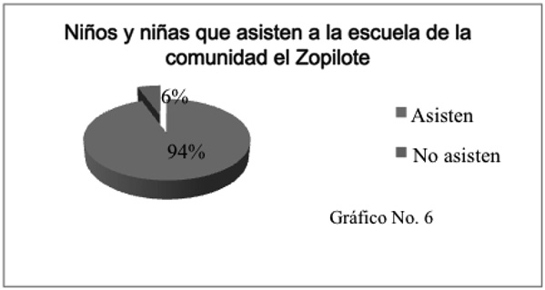Las comunidades no tienen ninguna atención y pasan desapercibidas, y no se aprecia si los niños del campo son explotados, porque lo toman como natural que la niñez trabaje muchas horas, y tampoco el trabajo que realizan no es visto acorde a su edad. En la figura Nº. 6 se refleja que el 94% de los niños asisten a clase, el 6 % no asiste a clase, claramente se manifiesta que es prioridad la educación para los niños y niñas en la comunidad el "Zopilote". Así lo expresó la señora González Rodríguez: “mis niños tienen que ir a clase, es mi responsabilidad que ellos se eduquen porque si yo no tuve esa oportunidad, por lo menos voy a luchar para que ellos no sean igual a mí”.