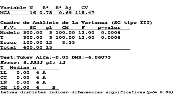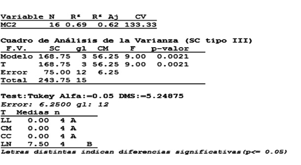 A continuación se presenta los resultado de las pruebas post-hoc de separación de medias según Tukey (∞=0.05) que señala los tratamientos específicos entre los que hubo diferencias estadísticas.