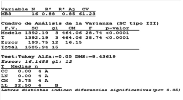 Para evaluar las diferencias entre tratamientos según las variables a medir, los datos fueron sometidos a un análisis de varianza (ANDEVA), y separación de media por prueba de rango múltiples de Tuckey con α = 0.005. Para ello se utilizó el programa InfoStat versión 2010.