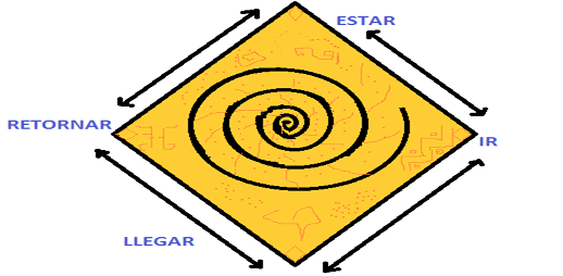 Son cuatro criterios que nos orientan al tejer en rombo o en espiral; se parte de la conciencia del ser, en un territorio marcado por la cultura y por el andar del tiempo; transita en el ir, buscando, lugares, tiempos y espacios; el llegar, visitando, ofrendando alimentos, tejidos y encontrando la palabra, la memoria, las personas, los animales y las plantas quienes nos comparten las sabidurías y conocimientos de la tierra; en el retorno, es el pensamiento en espiral que enrolla y desenrolla, cargado de sabidurías y conocimientos, los cuales se comparten en la medida que se va transitando por el camino, para empezar nuevamente el ciclo del ser y estar, ir, llegar y retornar. En cada ciclo y en cada tramo los sentidos están presentes y al igual que la luna y el sol, orientan todo el proceso.