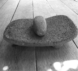 El metate o piedra de moler (Ki tiknaka), es un artefacto elaborado por los ancestros indígenas para ser usado como molino de granos que sirven como bebida o alimentos básicos en los hogares de los ulwas, actualmente esta piedra es conservada en algunos hogares, hay variedad en el acabado y tamaño , ya que depende del grano que se vaya a moler. El metate por lo general tiene una forma ovalada o rectangular cóncava denominada plato, por tres elementos de apoyo vertical o inclinados de forma cilíndrica llamados soportes y contiene una pieza complementaria llamada mano que es la que comprime los granos sobre la piedra. Independiente del tipo de metate, los componentes que lo integran conforman un sistema estructural que por su grado de simetría, así como por su composición y equilibrio de fuerzas, hace del sistema un conjunto de puntos desde el punto de vista estático.