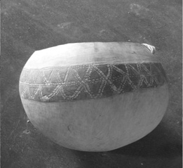 Esta jícara ha pasado por un proceso de raspado y pulido, tiene una franja de la corteza original que contiene una obra decorativa en la cual podemos apreciar figuras con forma de rombo, triángulo, líneas onduladas o quebradas. Las franjas están divididas en dos partes con una línea horizontal, sobre la línea horizontal se pueden identificar trapecios divididos en tres triángulos, a la vez se observan triángulos que contiene a la vez cuatro triángulos. Las líneas son formadas a partir de sucesiones de puntos, y la franja bordea el contorno de la jícara.