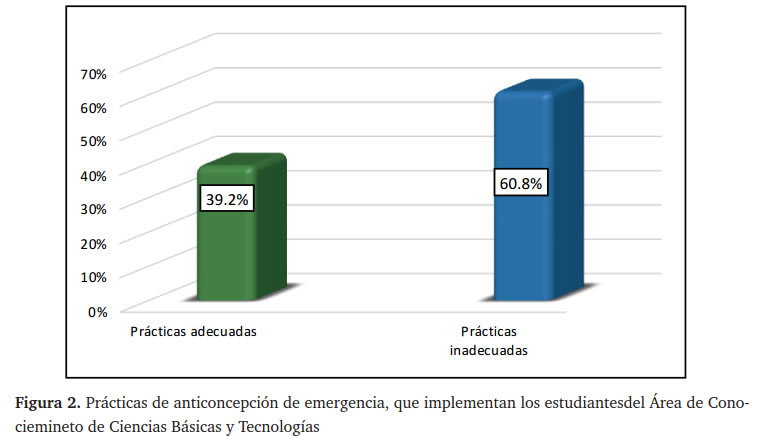 Con relación al presente estudio se logró identificar que el 58.3% utilizaban el método más de 3 veces en el año, el problema no sería el uso de la misma, sino el desconocimiento de su verdadero propósito para un adecuado consumo. La mayoría de las adolescentes y jóvenes ingieren las AOE para evitar embarazos no planeados haciendo uso excesivo, sin tomar en cuenta que su consumo frecuente puede ocasionar importantes daños a la salud. Según los resultados obtenidos, se aprecia que 39.2% desarrollaban prácticas adecuadas, mientras el 60.8% tienen prácticas inadecuadas, donde se puede evidenciar que las prácticas son incorrectas (Figura 2).