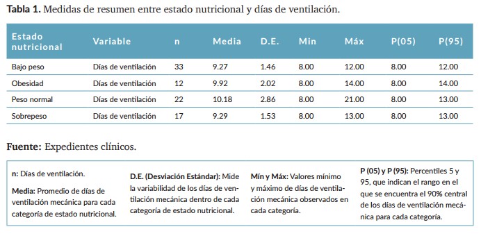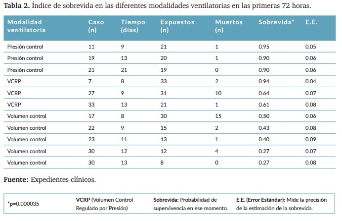 Se encontró una correlación significativa entre estado nutricional y días de ventilación, siendo bajo peso el grupo con mayor tiempo de ventilación mecánica prolongada (tabla 1). La modalidad ventilatoria volumen control mostró una curva de sobrevida que decrece más rápidamente en comparación con VCRP y presión control. Estos hallazgos sugieren que la elección de la modalidad ventilatoria y el estado nutricional son factores críticos en la evolución clínica de estos pacientes3 .