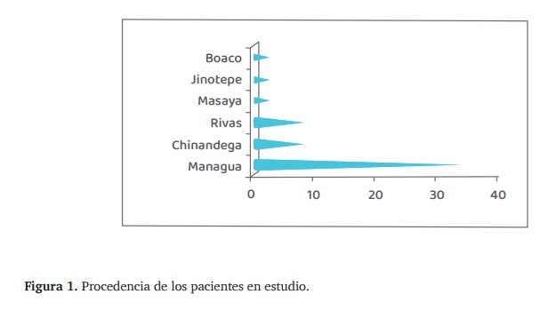 Con relación a la procedencia se encontró que la mayoría de los pacientes proceden de Managua con 34 casos (53%), 8 de Chinandega y Rivas (12.5%), 2 procedentes de Masaya, Jinotega y Boaco, respectivamente, lo que corresponde al 3.1%, y un caso en cada uno de los siguientes departamentos y municipios: Estelí, Nueva Guinea, Pueblo Nuevo, León, Niquinohomo, Granada, Tipitapa y Bluefields, (figura. 1).