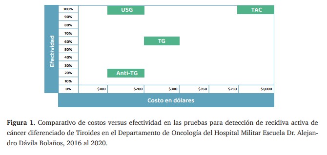 Debido a la incidencia del cáncer de Tiroides que representa el 16% del total de patología oncológica atendidas en el Hospital Militar Escuela Dr. Alejandro Dávila Bolaños (HMEADB), y dado a las diferencias en el seguimiento de los pacientes tiroidectomizados, se persigue con este estudio, aportar resultados útiles que permitan protocolizar este manejo y tener una idea del costo beneficio de la prueba. El análisis de costo-efectividad (ACE) generalmente se define como una evaluación comparativa de dos o más intervenciones en términos de costos y consecuencias. El objetivo de este estudio fue establecer el costo efectividad de la prueba de Tiroglobulina en la detección de recurrencias de los pacientes con carcinoma diferenciado de tiroides del Departamento de Oncología del HMEADB durante el periodo 1 de enero 2016 al 31 de diciembre 2020 y de esta forma fundamentar las directrices que regulen la utilidad de esta en la práctica clínica.