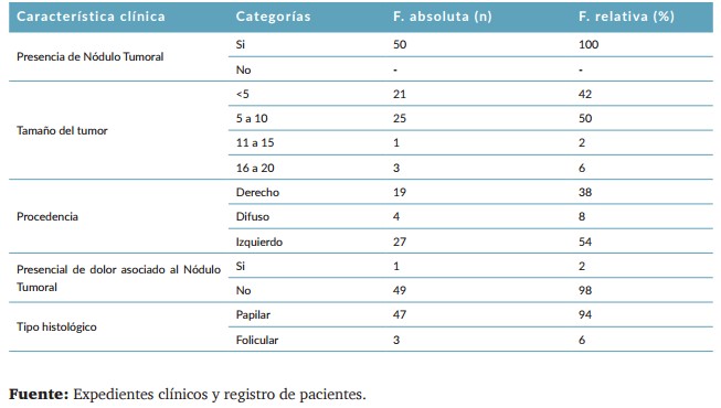 En cuanto a la presencia de dolor asociado al nódulo, solo 2% (1) paciente reportó dolor, mientras que la gran mayoría 98% (49) pacientes no presentaban dolor relacionado con el nódulo tumoral. En lo referente al tipo histológico, el 94% de los pacientes (47) fueron diagnosticados con carcinoma papilar, mientras que el 6% (3) presentaron carcinoma folicular, (Tabla 2).