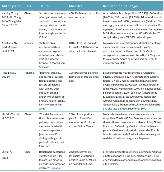 Tabla 1. Estudios sobre resistencia antibiótica de Escherichia coli en ITU pediátricas (2019-2024).