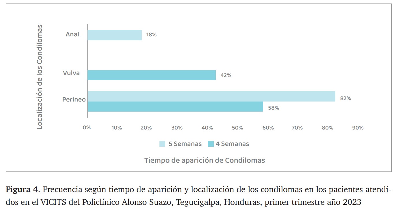 Entre los pacientes con lesiones de tipo condilomatosis, el 82 % (23/28) presentó aparición de lesiones en un lapso de 5 semanas, predominando en la región perineal. El 18 % (5/28) presentó lesiones localizadas en la región anal. En cuanto a las lesiones que aparecieron en un periodo de 4 semanas, el 58 % (7/12) se localizaron en la región perineal, seguidas por la región vulvar con un 42 % (5/12). (figura 4).