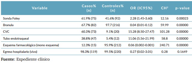 Entre los factores de riesgo vinculados a la hospitalización, se identificaron con significancia estadística variables como antecedentes patológicos personales, referencia hospitalaria y el uso de dispositivos médicos invasivos, especialmente sonda Foley, catéter venoso central y tubo endotraqueal. Asimismo, se identificaron factores protectores significativos como el antecedente patológico familiar, clasificación clínica, el uso de un solo dispositivo médico invasivo, empleo de bránula, monoterapia farmacológica y estancia en UCI menor de una semana.