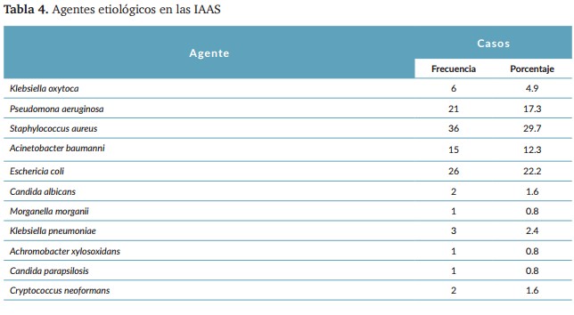 En cuanto a los agentes etiológicos, Staphylococcus aureus (29.7%), Escherichia coli (22.2%) y Pseudomonas aeruginosa (17.3%) fueron los más prevalentes. Esto concuerda con lo reportado en otros estudios, S. aureus como el germen más aislado (50.8%)7 , y E. coli como agente predominante en infecciones del sitio quirúrgico19. El patrón observado refuerza la importancia de estos patógenos como blancos clave en vigilancia epidemiológica, (tabla 4).
