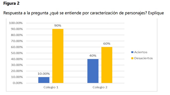 A continuación, se presenta el análisis correspondiente a la figura 2, en cual se muestra que tanto en el colegio 1 como en el 2 los estudiantes desconocen lo que es la caracterización de un personaje. Lo planteado refleja la necesidad de abordar los textos dramáticos en estudiantes de educación media, puesto que poseen poco o nulo dominio sobre este género literario, como consecuencia de que no se promueve mucho la lectura de este tipo de texto y esto problemas de comprensión lectora tanto en lecturas fáciles como en las complejas.