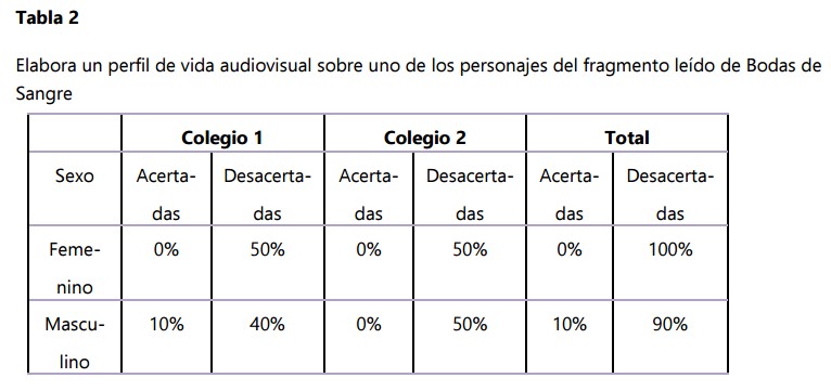 La tabla 2. proporciona los resultados de la tercera actividad en la prueba diagnóstica la cual orienta la elaboración de un perfil de vida audiovisual de uno de los personajes del fragmento leído de Bodas de Sangre. En la tabla se compara el rendimiento de los dos colegios, el Colegio 1 posee un rendimiento ligeramente mejor en comparación con el Colegio 2 en el grupo de estudiantes masculinos, ya que tienen un 10% de respuestas acertadas en lugar del 0% en el Colegio 2.