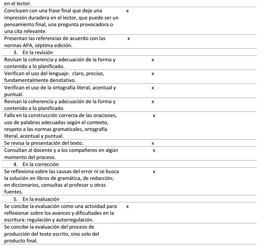 Perin (2018) menciona que el escrutinio del borrador de un texto es fundamental para conseguir durante la revisión del borrador, no obstante, los resultados evidenciaron que durante la inspección del texto los sujetos de estudio no mostraron interés en corregir la calidad del texto en cuanto a los errores de forma y contenido. Además, el cuidado en cuanto a la correcta escritura de las palabras fue superficial, por otro lado, no se observaron intentos por mejorar la claridad del lenguaje o ajustar el texto para que su comprensión estuviera adecuada al tema. Otro aspecto que incidió en los resultados de este diagnóstico fue la falta de retroalimentación entre compañeros o con el maestro lo que limitó el proceso de mejora en la redacción, lo que da como resultado una débil autorregulación en la escritura.