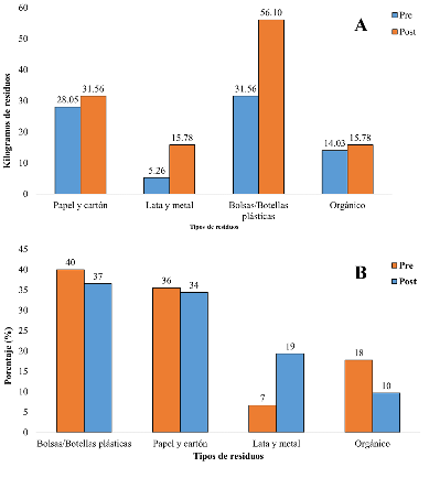 El Plan piloto de Manejo Integral estuvo compuesto por varias actividades dentro de las que destacan la estimación de la variación de la cantidad en peso y porcentaje de residuos sólidos producidos por el colegio. En este sentido la Fig. 1A demuestra un aumento del peso (Kg) total de los residuos, destacando las bolsas y botellas plásticas, aumentando un 56.10% en relación con la cantidad reportada antes del plan de manejo.