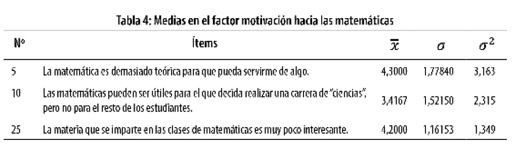 La motivación que es entendida como el impulso del sujeto a actuar de manera determinada (Santrock, 2010), está compuesta de 3 ítems que, al ser analizados, se aprecia que las puntuaciones de sus medias están en el intervalo de 3,4 a 4,3 lo que significa que los estudiantes manifiestan una motivación intrínseca muy baja hacia el estudio de las matemáticas. En el ítem 5 los estudiantes manifiestan estar de acuerdo con que las matemáticas son demasiado teóricas para que puedan servirle de algo, lo cual deja claro que los estudiantes se muestran desmotivados para trabajar con el área de las matemáticas, y que hay una fuerza interior que provoca que se comporten de esta forma, que les impida encaminarse hacia una meta. Es evidente que el estudiantado carece de motivación intrínseca, lo que los hace ver la asignatura del todo, disfuncional en la vida cotidiana, carente de herramientas necesarias para despertar en ellos el interés y la atención por los valores contenidos en la materia.
