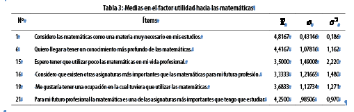 La utilidad entendida como el valor que el individuo le otorga a las matemáticas es un factor que está compuesto de 6 ítems. De acuerdo con los resultados obtenidos el análisis mostró valores entre 3,33 y 4,81 para las puntuaciones medias correspondientes a los ítems que componen este factor. El ítem 1, obtuvo una media de 4,8; lo cual significa que el estudiantado valora fuertemente de acuerdo esta proposición, es decir que se puede observar que las matemáticas son valoradas por la posibilidad que da para resolver problemas cotidianos, lo que se hace más evidente en los ítems 19 y 21, donde se manifiesta total acuerdo que la matemática es una de las asignaturas más importantes a estudiar para el futuro profesional y la posibilidad de aplicarla en otras ramas del conocimiento y poder ser usada como lenguaje en cualquier ocupación, por su belleza, su potencialidad y su simplicidad (Martínez, 2008). A este análisis también se suma la puntuación media obtenida en el ítem 6, donde el estudiantado manifiesta estar de acuerdo en querer llegar a tener un conocimiento más profundo de las matemáticas. Por consiguiente, se observa que se trata de una actitud positiva percibida por el estudiantado, en cuanto a la utilidad que tienen las matemáticas en su desarrollo cognitivo y en su desempeño como futuros profesionales.