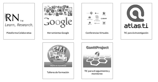 A partir de la constitución de los Paquetes de Trabajo (PT), el proyecto ALTER-NATIVA asumió la estrategia de Comunidades de Práctica (Wenger, 2001). En términos teóricos, la comunidad de práctica se constituye si entre sus miembros existe un compromiso mutuo de realizar una cierta empresa, lo que lleva a una práctica compartida en la que se genera aprendizaje de carácter colectivo. En este sentido, ALTER-NATIVA utiliza herramientas colaborativas e interactivas (Plataforma colaborativa; herramientas de google; conferencias virtuales; TIC para la investigación; talleres de formación; y TIC para el seguimiento y evaluación del proyecto) para construir los entregables del proyecto, véase la figura 1.