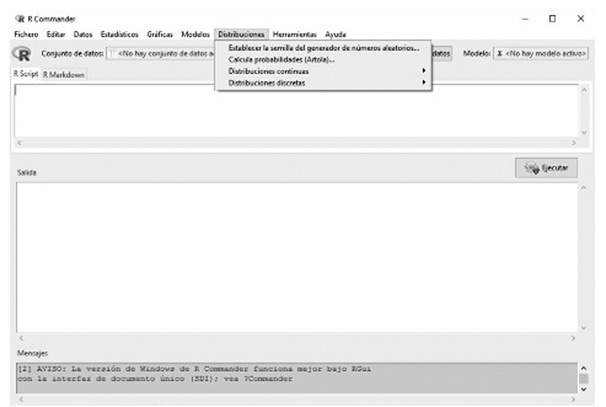 En la ventana de instrucciones (script Windows) se visualiza el comando de R que realiza internamente los cálculos lanzados por la elección del menú.