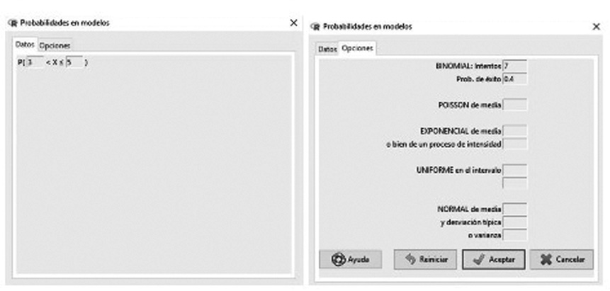 A manera de ejemplo, suponga que deseamos calcular la probabilidad de que la variable aleatoria sea mayor que tres, pero menor o igual a cinco, en un modelo de probabilidad Binomial con siete intentos y probabilidad de éxito de 0.40. En la pestaña de Datos, colocamos un 3 a la izquierda y un 5 a la derecha (parte (a) de la Figura 3), en opciones, nos ubicamos en Binomial: Intentos 7 y Prob. de éxito 0.40 (parte (b) de la Figura 3).