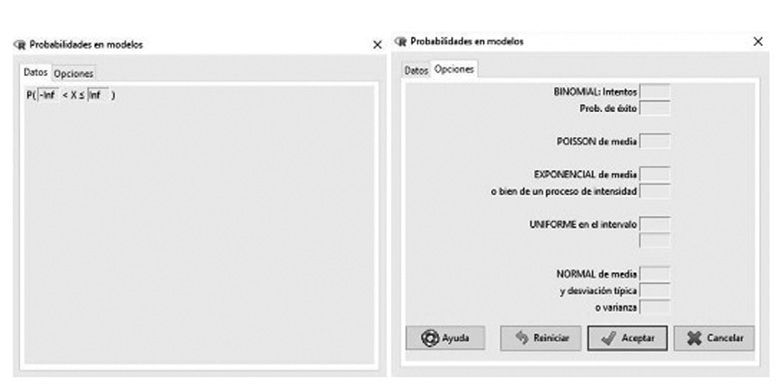 Las opciones de menú que ofrece la distribución actual de R Commander, para el cálculo de probabilidades de variables aleatorias que siguen un modelo de distribución conocido, son una gran ayuda comparada con la opción de escribir en la consola de R el comando que realiza dicho cálculo. Sin embargo, pensamos que aún exigen, del usuario, un conocimiento más que intuitivo de las propiedades de la probabilidad. Entre todas las acciones sobre variables aleatorias, las que corresponden al cálculo de probabilidades, están referidas como Probabilidades... y Probabilidades acumuladas.