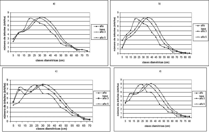 denotan la distribución diamétrica (árboles ha-¹) entre los años sucesivos
